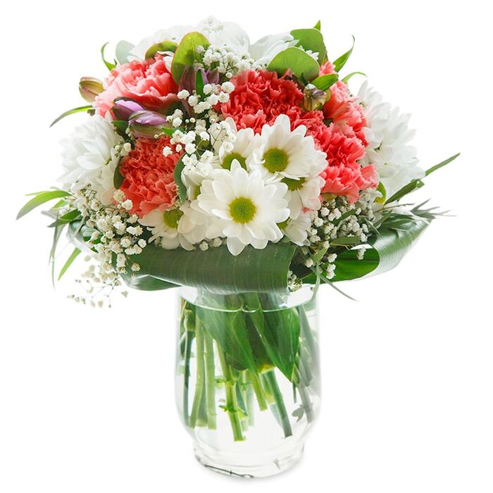 A truly sweet arrangement that will bring many smiles. Send this lovely seasonal mix of flowers and make someone day extra special. A soft colour palette of snow-white chrysanthemums and gypsophila, light pink carnations tightly wrapped in aspidistra leaves.
